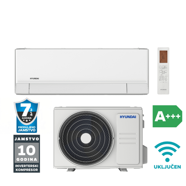 Klima uređaj Hyundai Elite Inverter Plus 2.7 kW sastoji se od unutarnje jedinice oznake ASCI-098CBW5B, vanjske jedinice ASCO-098CBW5B, infracrvenog daljinskog upravljača i WiFi upravljačkog modula. – saznajte više o Hyundai Elite Inverter seriji klima uređaja.